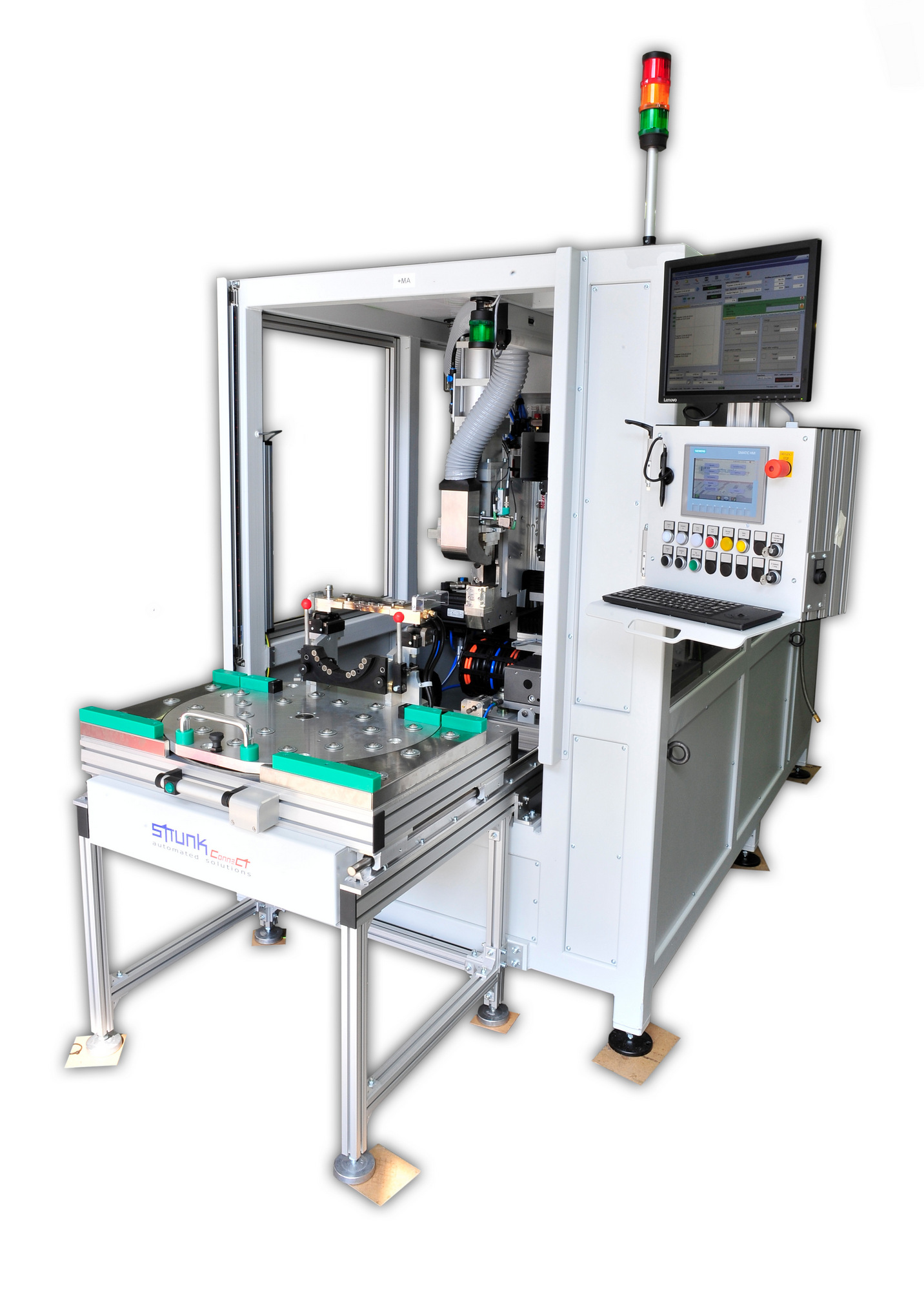 Diese Anlage ist für stehende Statoren auf Werkzeugträgersystemen konstruiert. Sie verfügt über eine STRUNK-Servo-Dreh-Hubeinheit sowie über ein Portalsystem…