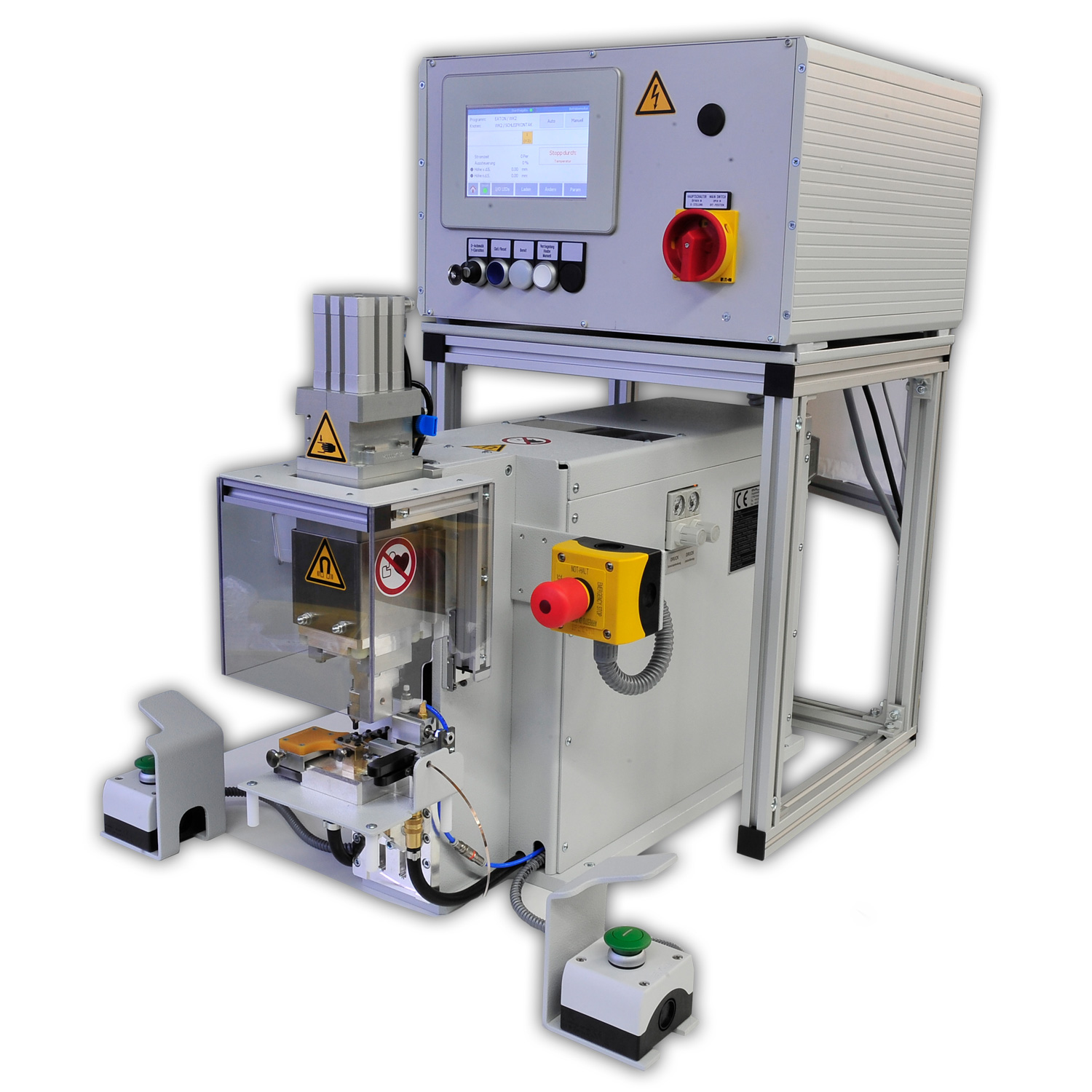 Hierbei handelt es sich um eine MSK-Mikroschweißanlage mit einem kundenspezifischen Wechselwerkzeug, manuellem Lotvorschub und automatischer Lottrennung. Der Maschinenaufbau…
